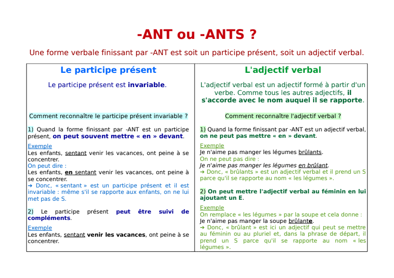 -ANT est invariable quand il s'agit du participe présent d'un verbe, c'est-à-dire quand on peut dire EN ...........-ANT ( en marchant, en jouant.... ).