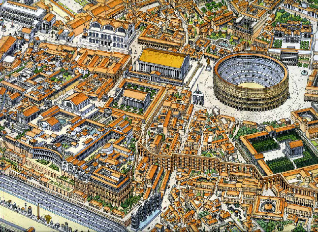 Bienvenue au Colisée ! Les Romains l'appelaient Amphithéâtre Flavien, parce qu'il a été construit, puis inauguré par deux empereurs de la dynastie des Flaviens : VESPASIEN et son fils TITUS, entre 75 et 80 après J.C.