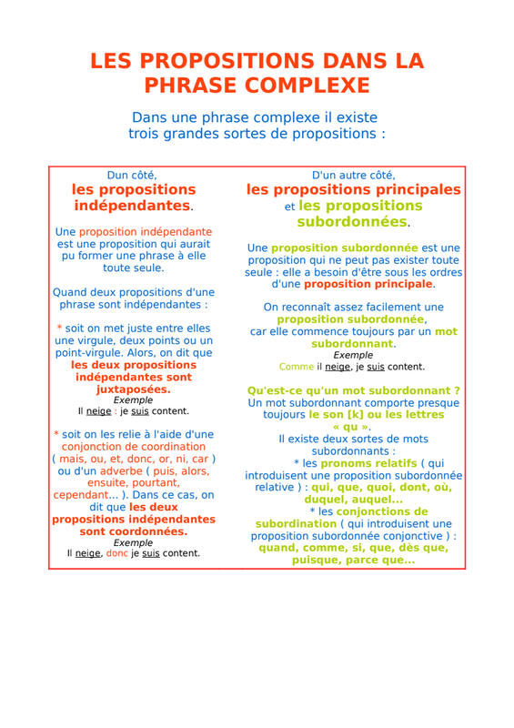 2) Nous allons continuer à travailler sur les propositions. Avant tout, faites-vous un petit test personnel et récitez-vous à haute voix ( sans crier quand même, surtout si vous êtes en famille ) les trois définitions que vous avez apprises mardi : proposition, phrase simple, phrase complexe. Vérifiez ensuite que vous ne vous êtes pas trompés, et réapprenez-les au besoin. A partir d'aujourd'hui, nous allons nous intéresser uniquement aux phrases complexes, c'est-à-dire à celles qui ont plusieurs propositions. Notre objectif est de comprendre comment ces propositions s'organisent entre elles. La leçon va peut-être vous paraître difficile, car je vais vous la donner en entier, mais nous allons faire des exercices pour la comprendre petit à petit, donc pas de panique ! De plus, quand nous aurons fini ces exercices, nous ferons un petit test que vous m'enverrez, mais qui ne sera pas noté, ce qui me permettra de savoir où sont vos difficultés pour vous aider. Reprenez s'il vous plaît la feuille de mardi ( que vous avez rangée partie "leçon" ), sautez une ligne sous votre exercice de rédaction au sujet des citations de Rousseau, et veuillez écrire la date d'aujourd'hui : JEUDI 19 MARS