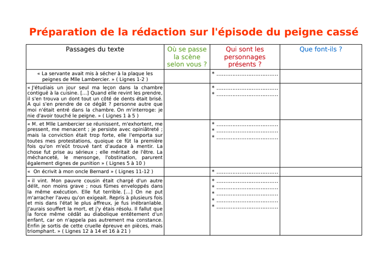 LUNDI 30 MARS Exercice sur l'épisode du peigne cassé : tableau de préparation de la rédaction