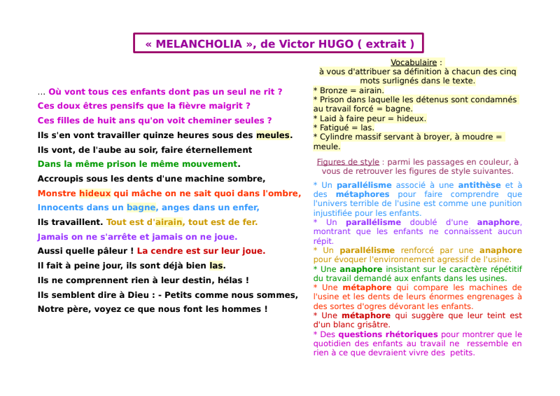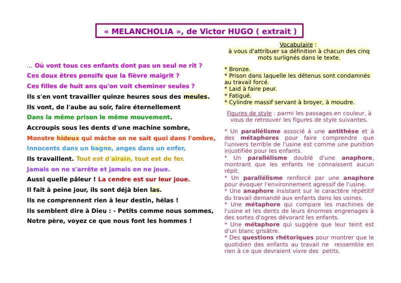 6) Si vous avez bien écouté le passage que je vous demandais, vous allez probablement en reconnaître le début dans l'extrait ci-dessous. Comme ce poème est très connu, je souhaiterais s'il vous plaît que vous accomplissiez deux tâches :  recopiez au stylo bleu les seize vers de cet extrait dans votre classeur, sous le titre que vous avez écrit tout à l'heure ( je vous demanderai de l'apprendre à partir de demain )  faites à l'oral ou dans votre tête les deux activités expliquées à droite de l'extrait ( il s'agit d'abord de deviner le sens des mots surlignés en jaune, ensuite d'identifier les figures de style écrites en couleur ).
