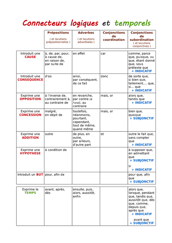 3) Bravo pour votre patience !  Continuons au sujet des liens logiques... Comme nous le disions mardi, vous avez déjà étudié des liens logiques l'an dernier. Vous avez les principaux d'entre eux sur une fiche que je vous ai déjà distribuée et que vous pouvez donc retrouver dans la partie "fiches" de votre classeur. Je vous redonne ci-dessous cette fiche. Observez-la un peu s'il vous plaît. Les mots écrits en rouge dans la colonne de gauche sont les sept principaux liens logiques : essayez d'apprendre ces sept mots à peu près par cœur. Ainsi, quand on vous demandera d'identifier un lien logique, vous saurez entre quelles possibilités vous avez le choix.