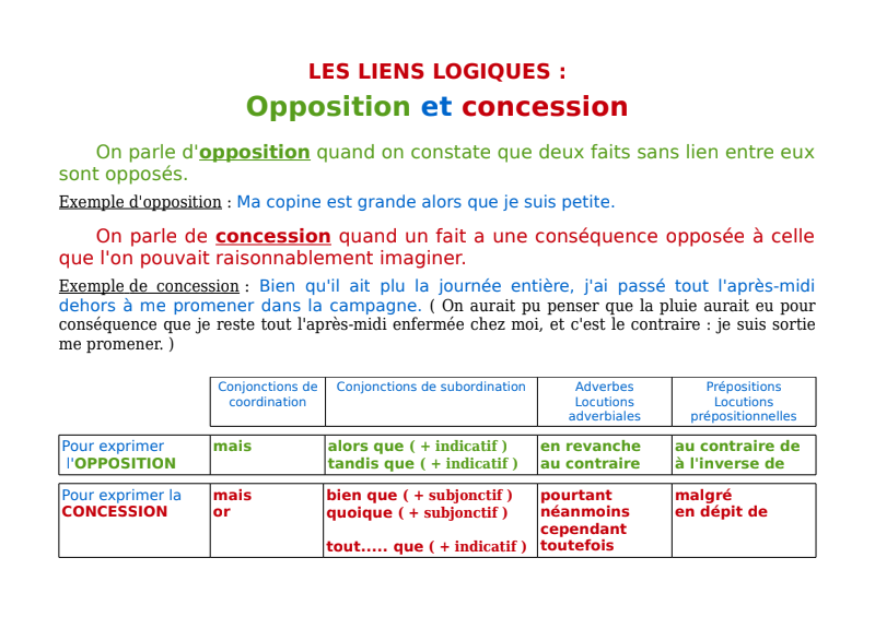 1) Bonjour à tous !  J'espère que vous allez bien et que vous n'avez pas froid chez vous avec ce retour de températures quasi hivernales ! Mardi, j'ai peur de vous avoir donné trop de travail, donc, aujourd'hui, nous allons réduire un peu la dose de français… et c'est une petite cure de grammaire et conjugaison qui va mettre du soleil dans votre vie !... euh… enfin… je l'espère…  Tout d'abord, nous allons faire une pause d'une journée dans l'apprentissage du poème de Victor Hugo. Prenez juste quelques minutes maintenant pour essayer de vous réciter les dix premiers vers, que vous avez déjà étudiés. Si vous n'y arrivez pas, relisez le début du poème ( que vous avez recopié dans votre classeur à la date du lundi 4 mai ), puis efforcez-vous de nouveau de le dire de mémoire. Une fois que vous vous êtes bien remis en tête les dix premiers vers de "Melancholia", veuillez s'il vous plaît prendre votre feuille du dernier cours ( où vous avez écrit la différence entre persuader et convaincre ), et noter à la suite les titres ci-dessous : JEUDI 14 MAI Leçon : opposition et concession