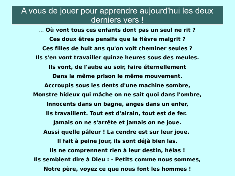 2) Ouf ! Vous avez pratiquement fini d'apprendre le poème de Victor Hugo : plus que deux vers ! Veuillez donc lire ce court diaporama pour en terminer.