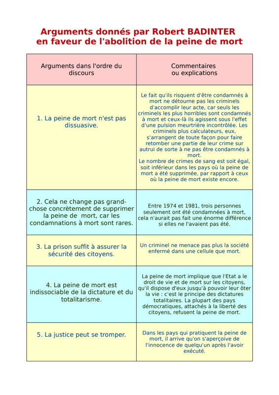 3) Vous deviez hier essayer de noter sept des arguments donnés par Robert BADINTER contre la peine de mort, ce qui n'était certes pas une tâche facile. Voici, en guise de correction, ceux que j'ai moi-même relevés. Vous avez s'il vous plaît trois missions :  tout d'abord, lire avec la plus grande attention toutes les pages du document ci-dessous afin de bien comprendre les idées de Robert Badinter. A gauche, vous avez l'argument exprimé simplement ; à droite, cet argument est expliqué et développé. Cette tâche est nécessaire pour réussir la rédaction, mais aussi dans votre formation de futur citoyen : dans trois ans, vous voterez et vous aurez donc à vous prononcer, même indirectement, sur des choix pour la société française. Il n'est pas trop tôt pour prendre l'habitude de réfléchir ! La peine de mort est un sujet sur lequel il est utile de se pencher, car il est en relation avec de nombreux thèmes importants dans la vie d'un pays : en réfléchissant à ce que dit Badinter, vous pourrez acquérir des convictions, quelles qu'elles soient, fondées sur un vrai raisonnement.  ensuite, choisir dans ce tableau les quatre arguments qui correspondent le mieux à vos idées ou que vous comprenez le mieux. Ce sont les arguments que donnera Robert Badinter dans votre dialogue de jeudi.  enfin, recopier les quatre arguments que vous avez choisis ( seulement la colonne de gauche ) sur votre feuille, au-dessous des titres notés tout à l'heure. Bon courage !
