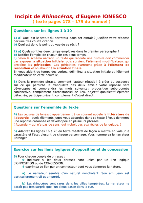 1) Bonjour à tous ! J'espère que votre week-end s'est bien passé et que vous avez pu décompresser un peu ! Toutes mes excuses à ceux qui devaient rendre leur travail à partir de samedi : j'étais persuadée d'avoir préparé votre colonne vendredi, mais je ne me suis aperçue seulement hier soir que j'avais oublié de le faire et qu'à cause de moi, vous n'avez donc pas pu profiter du week-end pour envoyer plus tranquillement vos photos… Je suis vraiment désolée de vous avoir ainsi mis dans l'embarras, déjà que vous avez beaucoup de travail et qu'il ne vous est pas facile de vous organiser… De ce fait, j'ai préparé toutes les colonnes jusqu'à la fin, et ceux qui n'ont pas encore envoyé leur travail peuvent tous le faire jusqu'à dimanche soir 7 juin. Si un problème personnel vous en empêche, surtout n'hésitez pas à le me le dire pour que je vous donne un délai supplémentaire. Nous commençons aujourd'hui notre dernier chapitre de l'année, ce qui donne un peu le bourdon étant donné que nous ne sommes toujours pas revenus au collège ! J'espère que vous tenez le coup et que réussissez à avoir de petits moments agréables qui vous consolent d'être séparés de vos camarades : peut-être avez-vous même pu vous revoir ? Ce dernier chapitre portera sur des débuts de romans et de nouvelles du vingtième siècle et aura deux objectifs principaux : vous familiariser avec des façons d'écrire un peu originales d'auteurs modernes  revoir les points de vue. Par ailleurs, nous ferons encore deux rédactions avant de pouvoir partir en vacances l'esprit tranquille. A ce propos, je constate que les rédactions sont l'exercice que vous avez le plus souvent laissé de côté. Je le comprends parce que c'est une tâche longue et difficile, qui demande de la réflexion et de la concentration. Néanmoins, la rédaction est aussi l'exercice le plus important en français avec la lecture : au lycée, vous lirez et rédigerez sans cesse, vous devez donc vous entraîner avec le plus grand sérieux dans ces deux domaines. Par conséquent, si vous n'avez pas fait toutes les rédactions, je vous engage vivement à les faire pendant les vacances : je laisserai le netboard actif jusqu'à la rentrée pour que vous puissiez y retrouver toutes les informations nécessaires. Le slogan du jour : rédiger, c'est réussir ! Bon, j'arrête la propagande : lançons-nous plutôt dans le nouveau chapitre ! J'aimerais s'il vous plaît que vous écriviez en haut d'une nouvelle page, à la suite du cours précédent : CHAPITRE 5 : INCIPIT de romans et nouvelles du vingtième siècle MARDI 2 JUIN Exercice : questions sur l'incipit de Rhinocéros, d'Eugène Ionesco