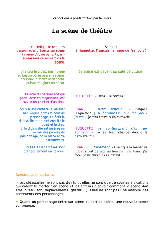 6) De nouveau la fiche sur la présentation d'une scène de théâtre ( que je vous ai déjà montrée quand vous avez travaillé sur le peigne cassé ), pour réussir la question 5.