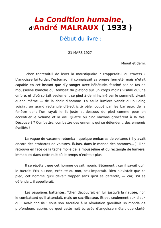 6) Ce sera tout pour aujourd'hui : demain, nous ferons un exercice sur le point de vue interne et nous approfondirons ainsi la réflexion sur le texte de Malraux.