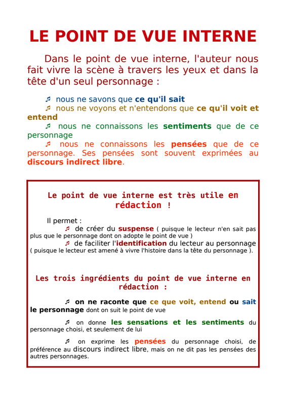5) Nous venons de voir que ce texte est raconté du point de vue interne : j'aimerais donc s'il vous plaît que vous révisiez les caractéristiques du point de vue interne en lisant la fiche ci-dessous.