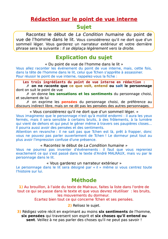Nous allons terminer la semaine avec un exercice de rédaction qui achèvera aussi notre travail sur l'extrait d'André MALRAUX. Cet exercice de rédaction porte sur le point de vue interne et il va nous occuper aujourd'hui et demain.